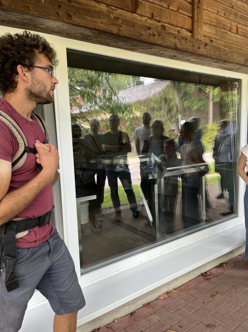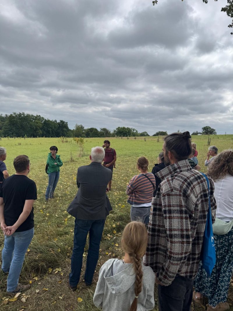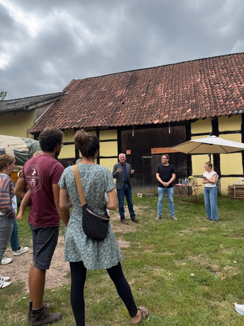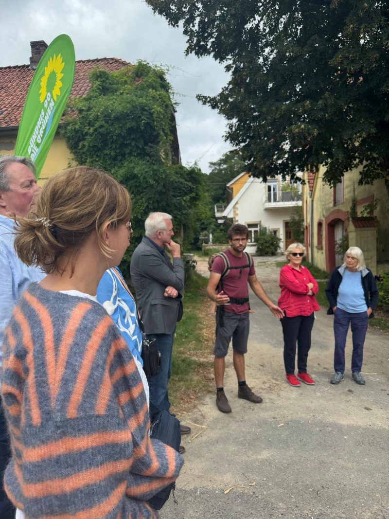 Besichtigung des Ziegenhofes „Wurzeln und Hörnern“ mit Norwich Rüße August 31, 2025August 31, 2025 Am 16. August hat Till Kröner den grünen Landratskandidaten Norwich Rüße, Mitglieder des Ortsverbandes der Grünen Tecklenburg und Interessierte auf seinem Bioland-Betrieb „Wurzeln und Hörner“ auf Haus Hülshoff willkommen geheißen. Eine gute Stunde führte der Junglandwirt ca. 20 Besucher*innen über Weiden, Felder und den Hof und gab Einblicke in die vielfältigen Projekte des Hofes. 60 der 120 Ziegen gilt es jeden Tag zu melken und die Nachzucht zu organisieren. „Aurelie ist die Chefin“, so Till Kröner, und stellt die Leitziege der Herde vor. Ein Blick in die gläserne Käserei zeigt, wie arbeitsintensiv Käseherstellung ist. Ein Teil der Fläche ist als Agroforstfläche angelegt, d.h. landwirtschaftliche Produktion wird mit dem Anbau von Bäumen und Sträuchern kombiniert. Till Kröner erhofft sich durch Synergien aus Tierhaltung, Forstwirtschaft und Ackerbau eine zukunftsfähige, klimaangepasste Aufstellung seines Betriebes. Im Rahmen mehrerer Forschungsprojekte wird dieses Vorhaben begleitet: z.B. untersucht das Projekt „FuLaWi“ (Futterlaubwirtschaft), inwiefern die Anpflanzung und Bewirtschaftung von Futterlaubhecken aus Pappeln und Weiden zukünftig einen Großteil des Mineralfutters für die Ziegen liefern kann. Ein Vermarktungsweg der auf dem Hof erzeugten Produkte ist die SoLaWi (solidarische Landwirtschaft), die in Kooperation mit der ebenfalls auf dem Hof verorteten Gärtnerei eine feste Gruppe von Menschen aus der Region über ein Jahr hinweg versorgt. Mitglieder der SoLaWi erhalten jede Woche einen Teil des angebauten Gemüses, der Molkereiprodukte, des Fleisches, der Eier sowie des Brotes, das in der hofeigenen Backstube gebacken wird. Neben der Landwirtschaft und Lebensmittelproduktion präsentierte Till Kröner noch weitere auf dem Hof verortete Projekte: so hat z.B. die stadtbekannte Postkutsche hat ihren Stammsitz auf dem Hülshoff. Außerdem belebt die Janusz Korczak-Schule ein Nebengebäude als außerschulischen Lernort. Jugendliche mit besonderem Förderbedarf erleben hier ihren Schulalltag, kümmern sich um zwei Esel, Hühner und packen auf dem Hof mit an. So werden Tagesstruktur und Verantwortungsbewußtsein in einem gefördert. Krönender Abschluss des Hofrundganges und geselliger Ausklang des gelungenen Nachmittags war die Verkostung der unterschiedlichen Produkte am Ort ihrer Entstehung: verschiedene Ziegenkäsesorten, dreierlei Brot, selbst angebautes Gemüse und Salami aus Ziegenfleisch ließen die unterschiedlichen Stationen der Hofführung auch kulinarisch noch einmal erleben.